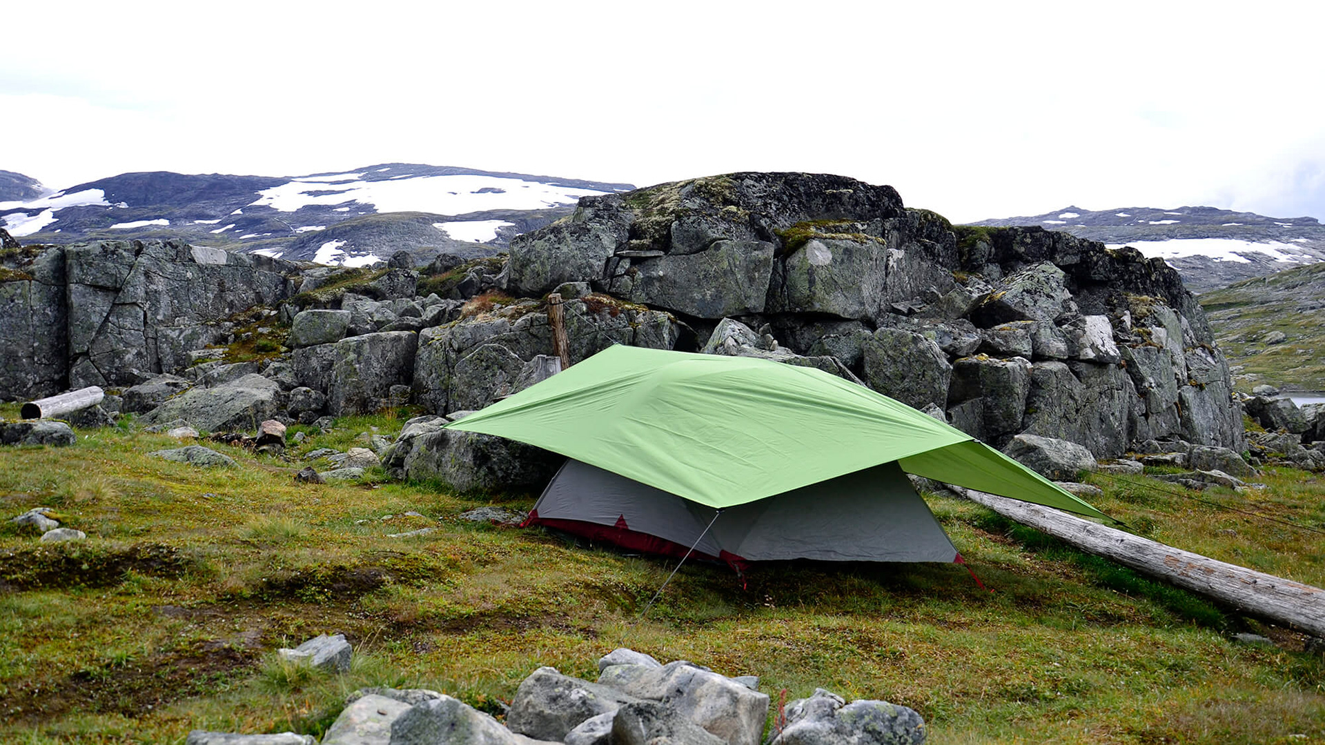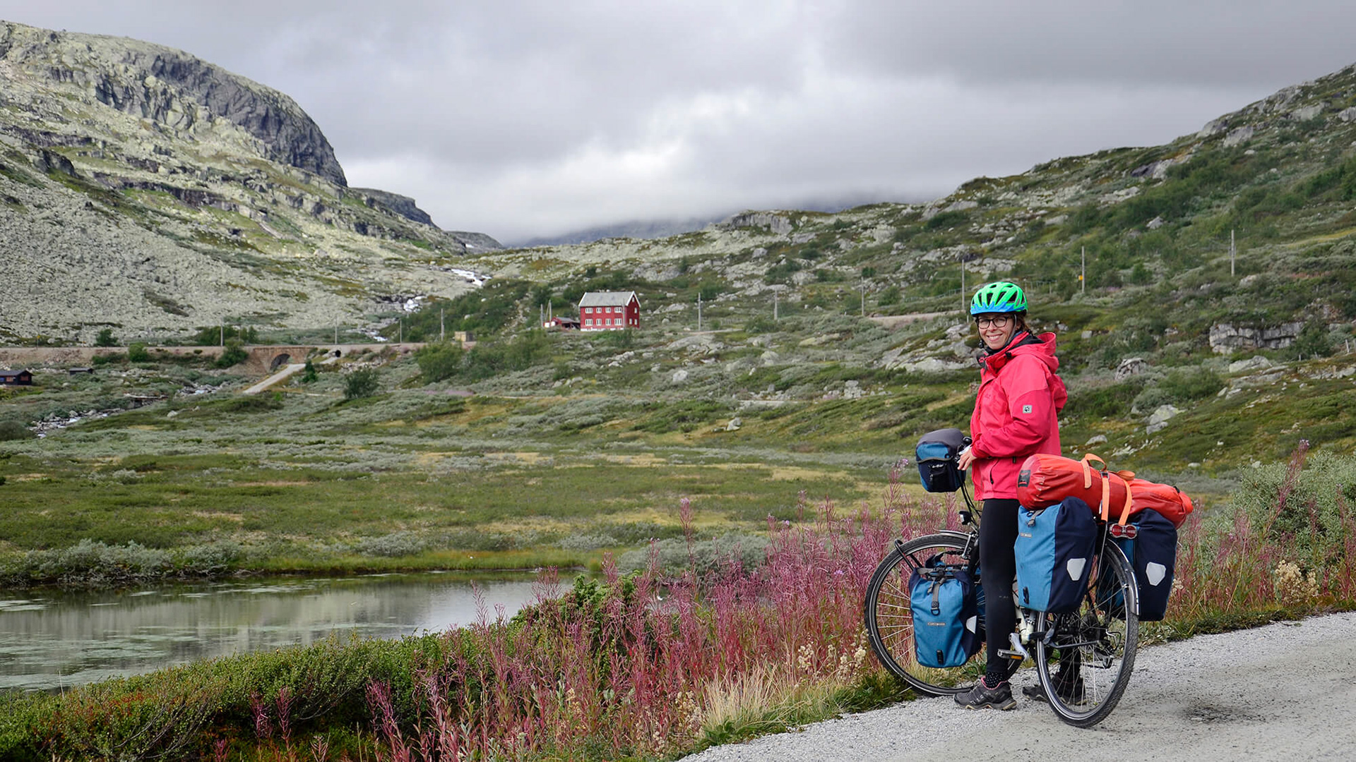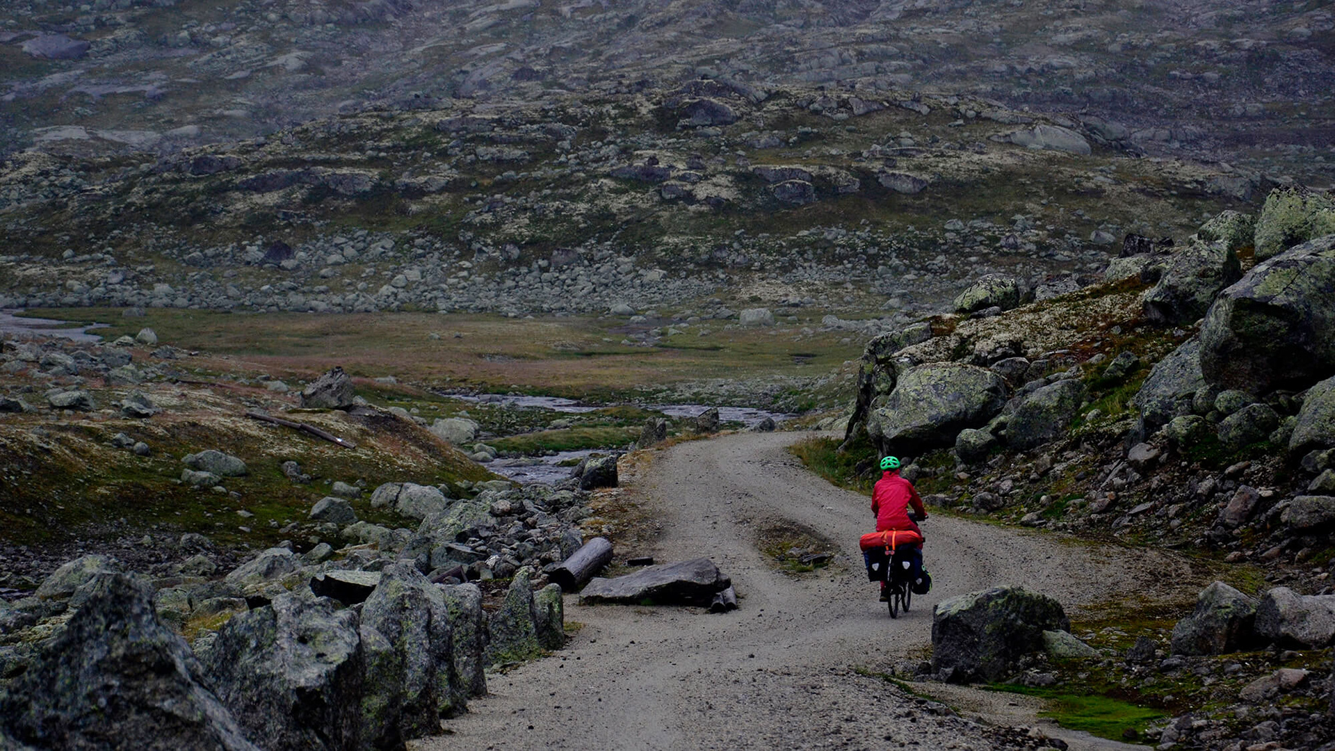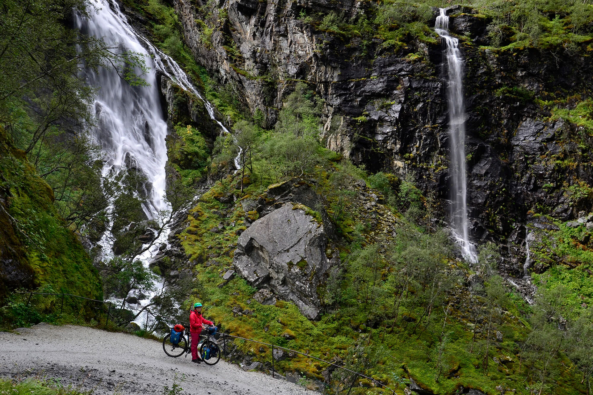 Shortly before the end of the »Rallarvegen«, it rained so badly for many hours that in the evening, soaking wet, freezing and totally exhausted, we found ourselves in the reception of the only hotel in the area and got a room. Since the hotel's drying room was already completely overloaded, we quickly rearranged the furniture in our own room – a floor lamp is a great way to dry a wet tent! The next day the rain had fortunately decreased and we rode 17 kilometers down a steep descent down to sea level, past several waterfalls, and were joined by a herd of goats.